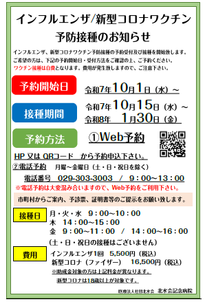 インフルエンザ、新型コロナワクチン予防接種の予約受付及び接種を開始いたします。
