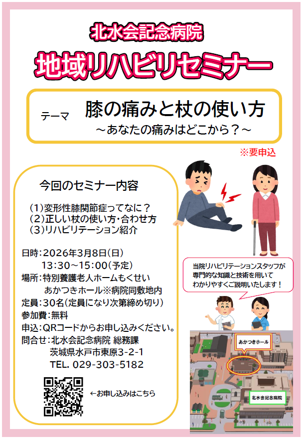 北水会記念病院主催 地域リハビリセミナー 「膝の痛みと杖の使い方~あなたの痛みはどこから?~」(参加費無料、定員30名)を