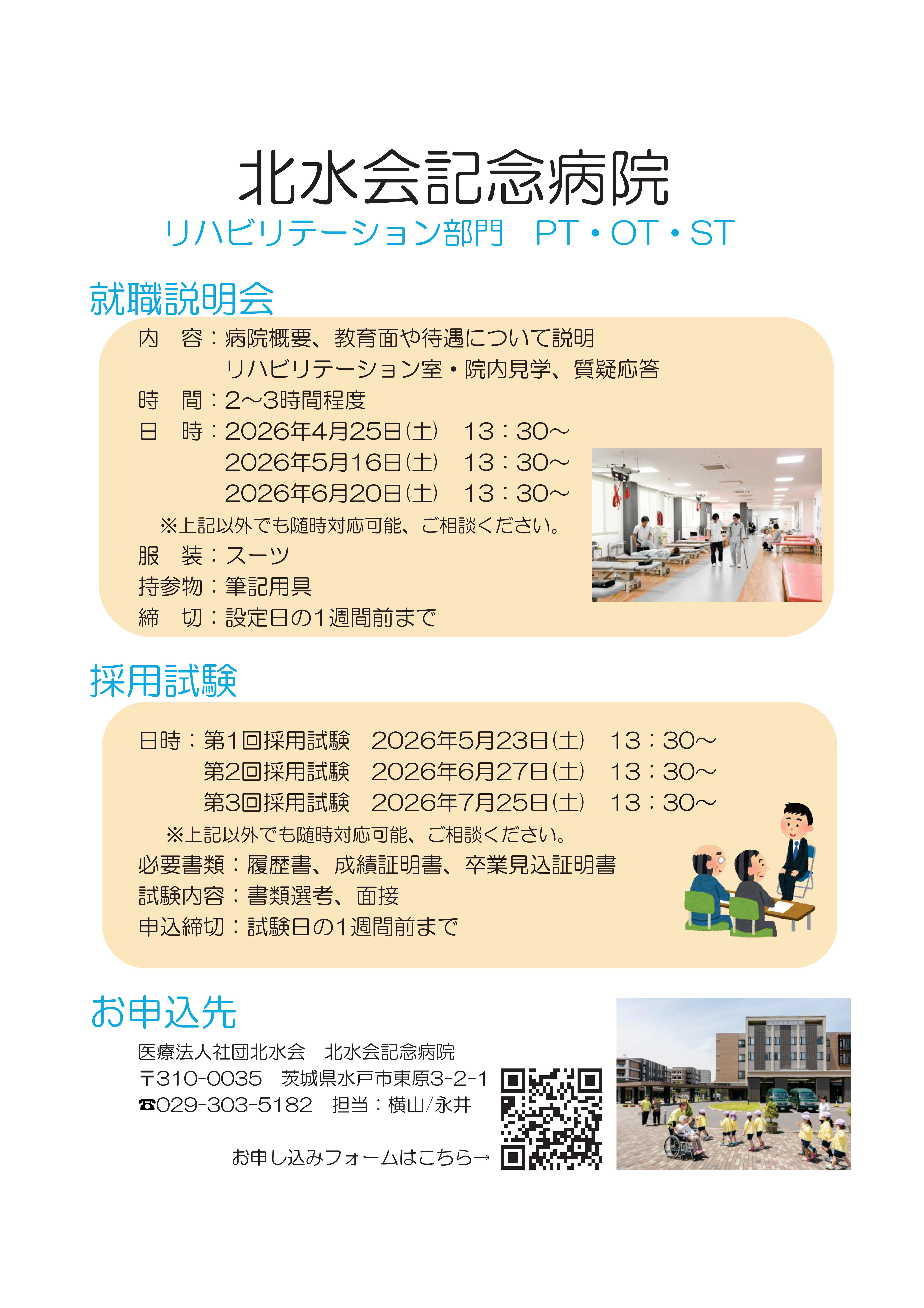 リハビリ職(新卒・既卒)を対象とした就職説明会・採用試験を実施いたします。